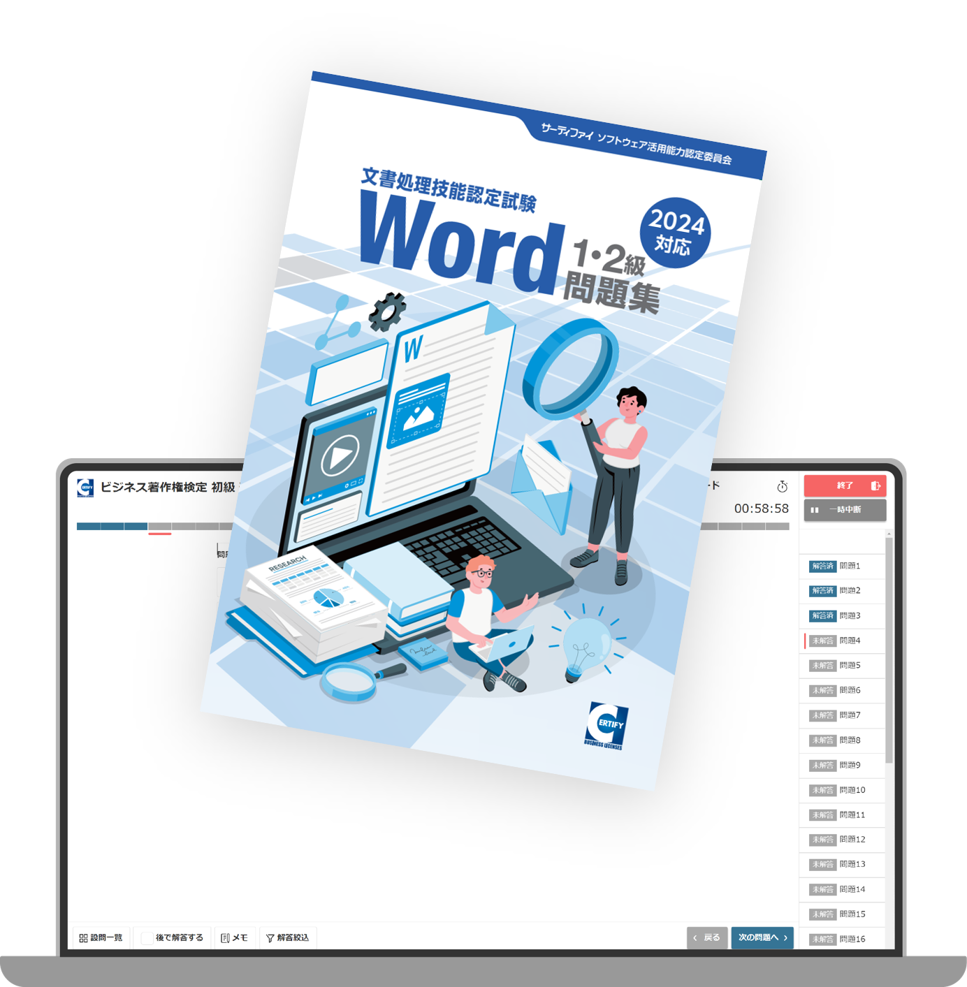 ※Word文書処理技能認定試験1・2級のデジタル問題集は、「テーマ別知識練習問題」のみスマートフォンでもご利用いただけます。実技問題はスマートフォンに対応しておりませんので、PCでのご利用をお願いいたします。