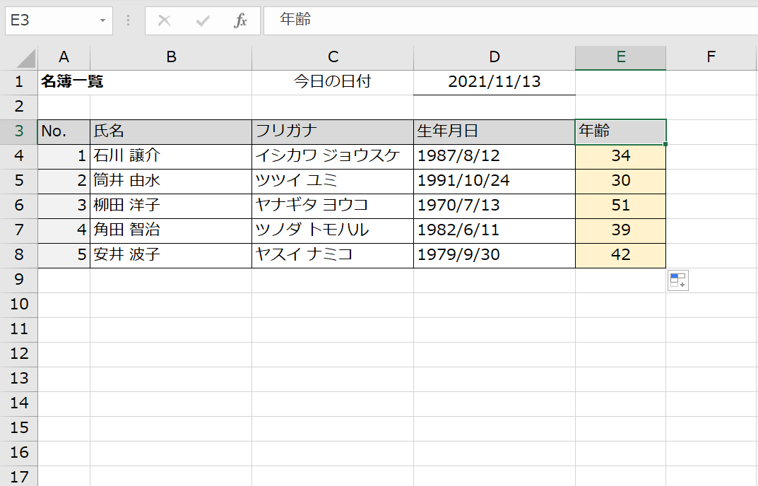 年齢算出にはこのTODAY関数を使用しますが、「使用する時点」での年齢が分かりますね。