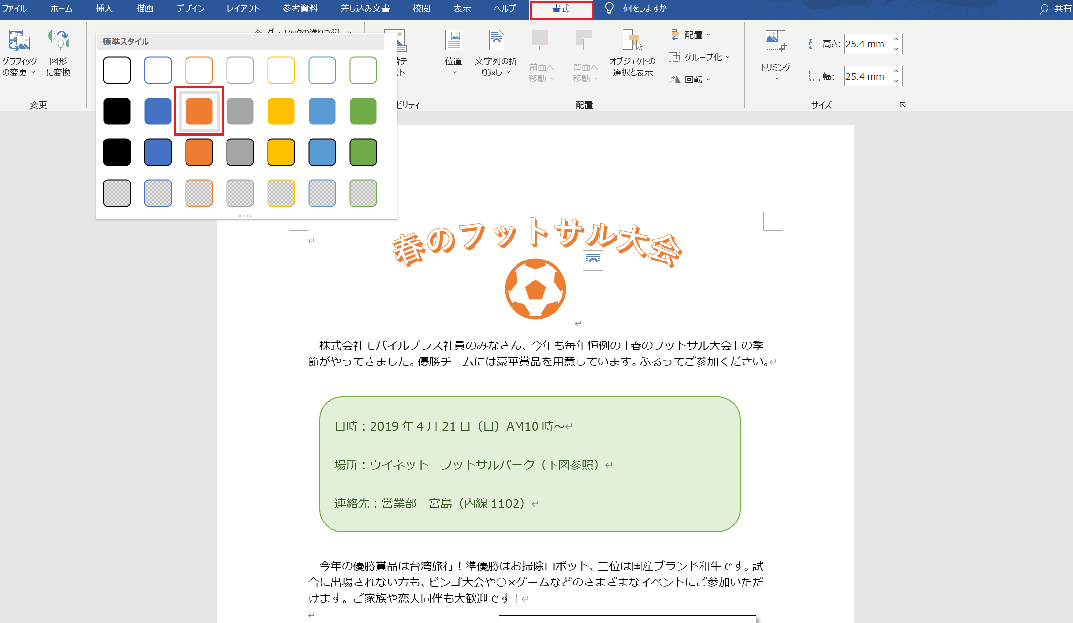 明るい色に変更したいので、「書式」タブの「グラフィックスタイル」より、変えたい色を選択します。